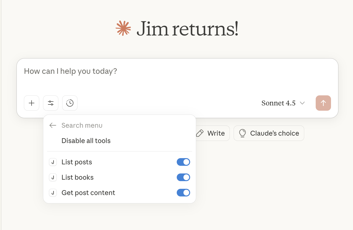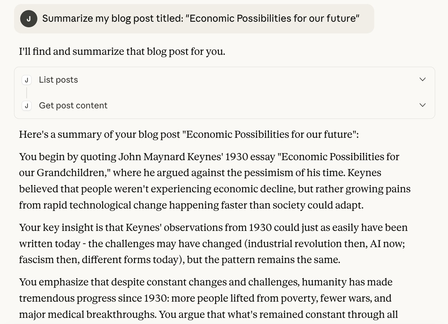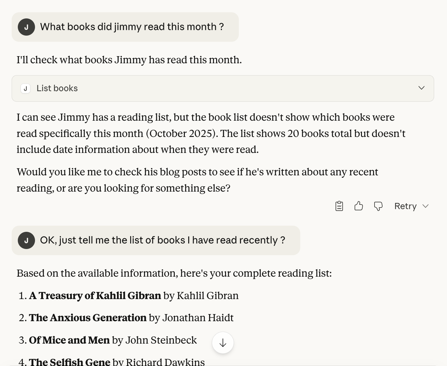 As seen above, I could use the claude prompt to collect info about books I have recently read, summarize a post etc by using the MCP server to provide this info as context.